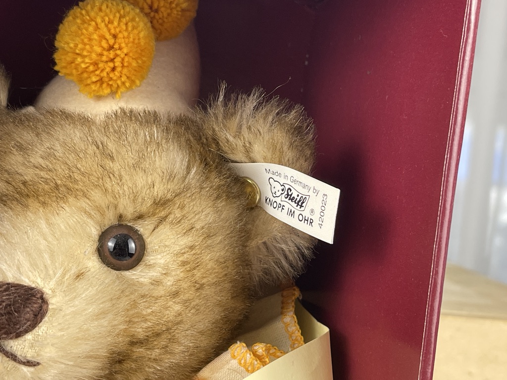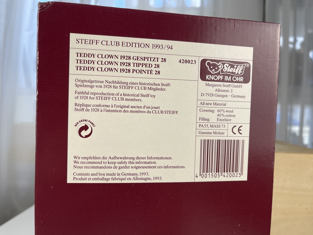 Produktinformationen "Steiff Tier 420023 Club 1993 Teddy Bär Clown 28 cm. Top Zustand + OVP & Zertifikat (ohne Deckel)"